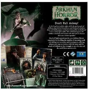 In Dead of Night, investigators explore the facets of Arkham best left unseen in the light of day. Organized crime builds a strong foothold in the city, secret cults labor for a dark master, an alien moon hangs overhead, and unknowable horrors stalk the night. is expansion includes two all-new scenarios, new encounters for every location in Arkham, new monsters and anomalies, and four new investigators to face these fresh horrors, armed with new spells, items and allies.