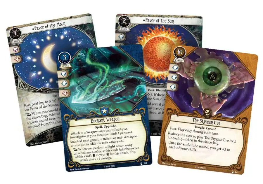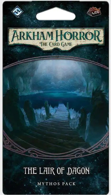As The Innsmouth Conspiracy cycle approaches its climactic conclusion, youll find the next chapter of the unfolding story within The Lair of Dagon Mythos Pack, beckoning the investigators deeper into danger and closer to the heart of the sea. Youll need new tools and skills if you plan to take the Order of Dagon head-on, and fortunately, this Mythos Pack comes filled with an assortment of new player cards for every aspect, giving you the perfect cards to upgrade your deck as you gain more experience and ramp up to the finale of your campaign.