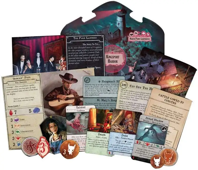 Under Dark Waves is a new large box expansion for Arkham Horror, taking your investigations beyond the town of Arkham to the other ill-fated towns of Massachusetts. Two new double-sided tiles bring Kingsport and Innsmouth to vibrant life, while eight more investigators arrive to join your party, ranging from a drifter like Ashcan Pete to a letter carrier such as Stella Clark. These investigators will have their work cut out for them with four entirely new scenarios pitting them against the horrors that lurk beneath the ocean waves. With over 150 encounter and event cards, alongside new assets, monsters, conditions, and the terror mechanic, Under Dark Waves boasts a vast undersea treasure trove, pulling you into some of the Cthulhu Mythoss most compelling tales.