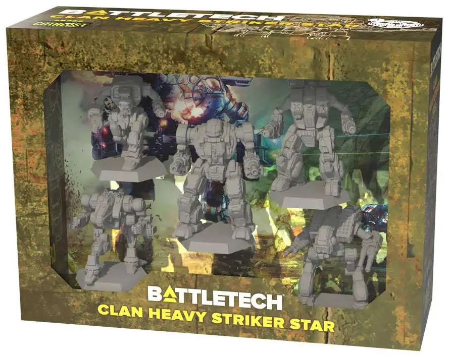 The Clan Heavy Striker Star includes the Gargoyle, Hellbringer, Mad Dog, Ice Ferret, and Viper -no assembly required- along with five MechWarrior pilot cards and five Alpha Strike cards.
