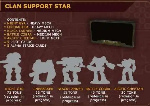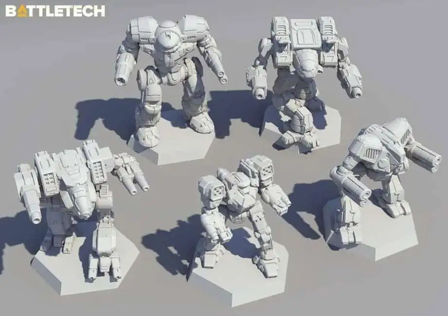 (no assembly required) along with five MechWarrior pilot cards and five Alpha Strike cards.