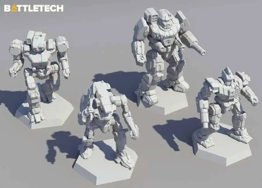 each Inner Sphere Lance includes four ‘mechs (no assembly required) along with four MechWarrior pilot cards and four Alpha Strike cards.