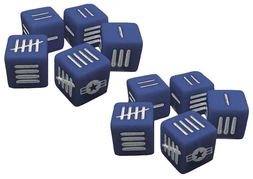 Dice pack contains 10 D6 (6 sided) dice with a symbol belonging to their military force, in exchange for the number 6. The traditional dots are replaced by much more thematic tally marks.