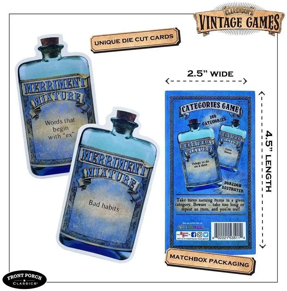 Claredon’s Merriment Mixture Vintage Card Game is a fast-paced game of categories. Draw a card from the deck, announce the category and start playing. Players are eliminated when they can’t come up with a new answer! Be quick, if you take too long or repeat an item, you are out. First player to collect 3 cards wins the game. Front Porch Classics is a distinctive line of expertly crafted games and puzzles that brings the best-known pastimes from around the world to your home. Beautifully and uniquely designed, these products make the perfect gift for any occasion. From coffee table games like State Fair Bingo and Shut-the-Box to the great classics like Rummikub, Front Porch Classics products are made to share and last for generations.