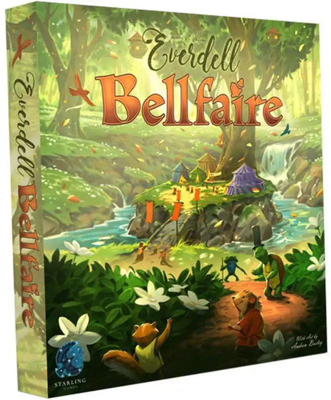 Bellfaire is a modular expansion for Everdell packed with exciting new content to experience! Unique player powers for each type of critter in Everdell. Rules for 5-6 players. The Bellfaire board with a revolving Market location, and endgame Garland awards.