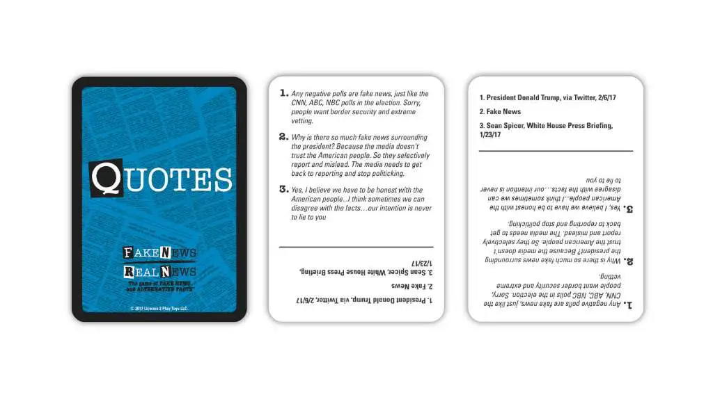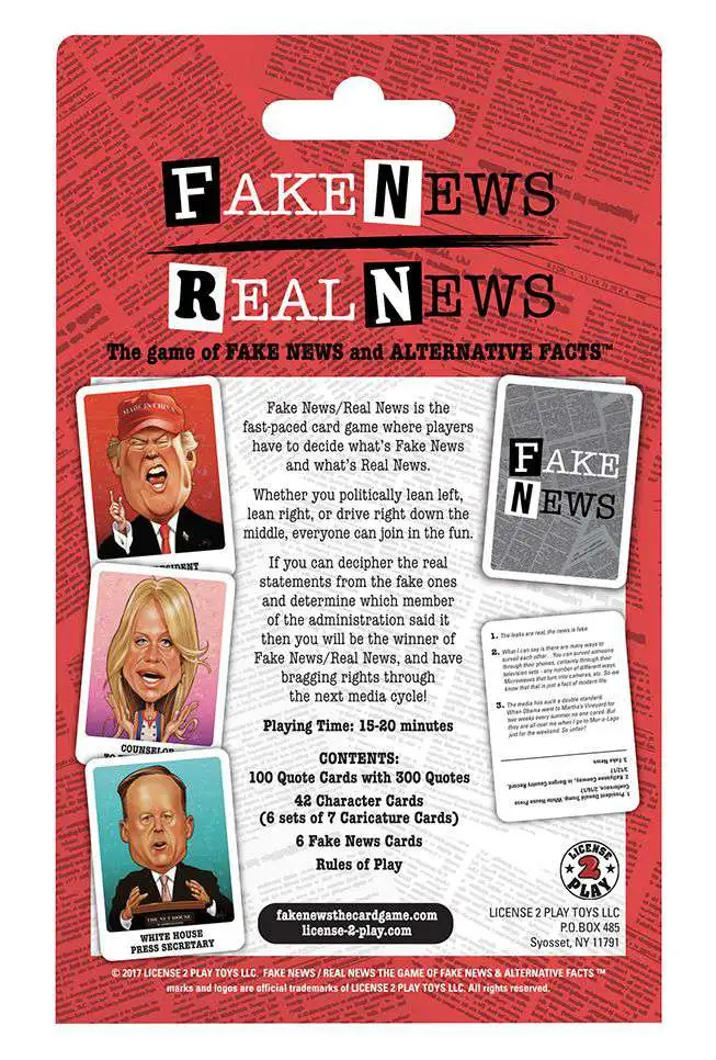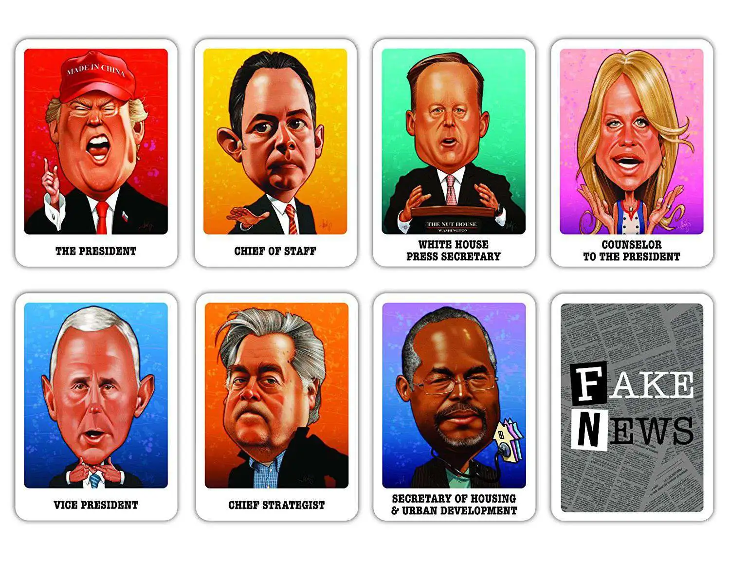 Fake News / Real News is the fast action card game of Fake News and Alternative Facts. Fill your cabinet in your hand, each player will have 7 character cards, The President, Vice President, White House Press Secretary, Chief of Staff, Counselor to the President, Chief Strategist, and Secretary of Housing and Urban Development as well as 1 Fake News Card. Flip over the quote card and be the first to determine who said the quote or if you believe no one did, then drop down the FAKE NEWS card. The first to 11 correct answers wins it all and is the champion!