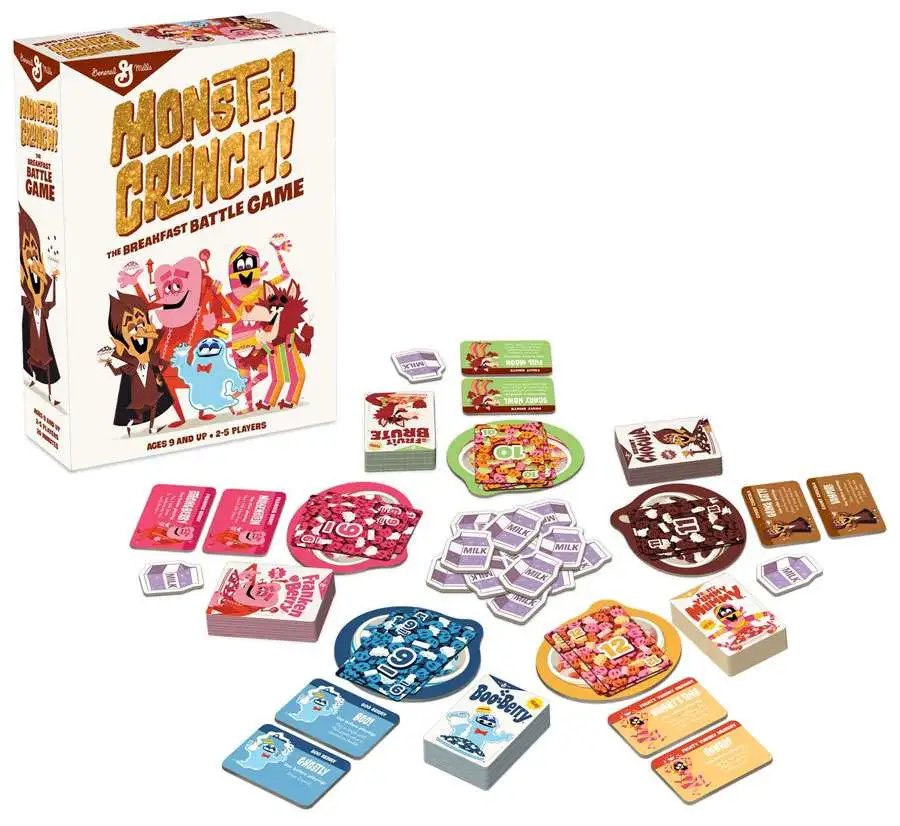 It’s ok to play with your food! Pick your favorite Monster Cereal character and battle to see who can “eat” the most cereal. In this fast-paced game of luck and strategy, players collect as many Cereal Cards in their Bowls as they can. Each Monster has special powers to give you an advantage and help you gobble up the most cereal. Use Milk Tokens to combine Cereal Cards and take bigger bites. The Monster Cereal character that munches the most wins the game!