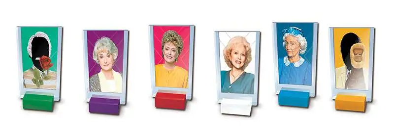 The Golden Girls Clue features a custom illustrated game board, where players attempt to solve the crime of WHO ate the last piece cheesecake, WHAT they left at the scene of the crime, and WHICH room they did it in.