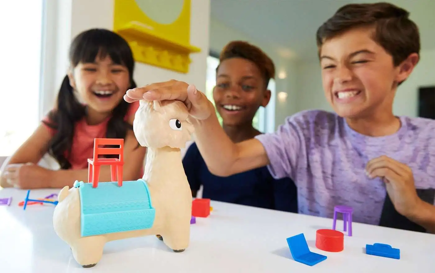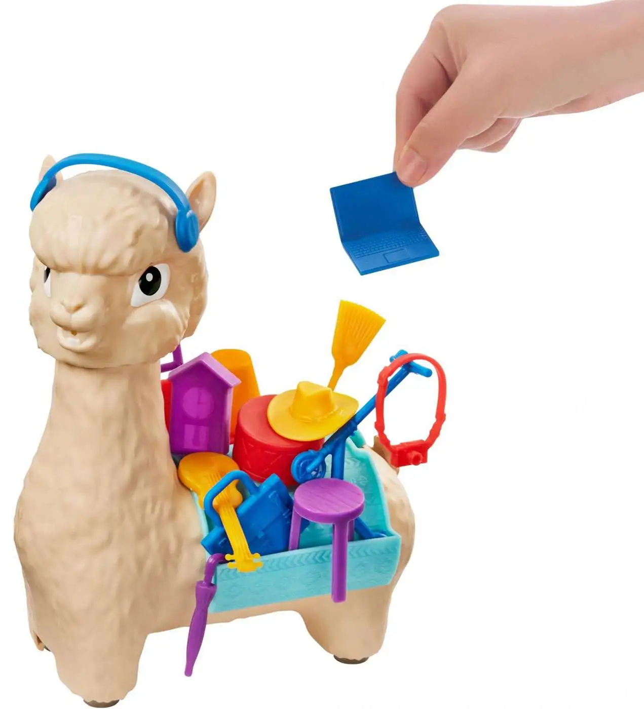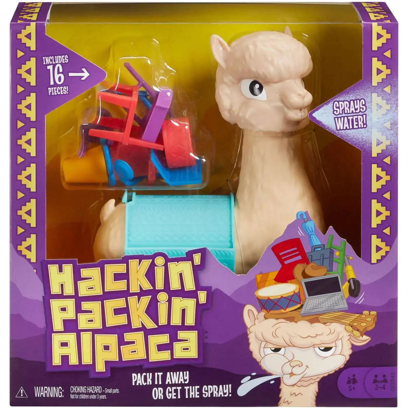 Hackin’ Packin’ Alpaca is the hilarious kids’ game with lots of cargo and one spittin’ mad alpaca! To play, take turns stacking pieces of your cargo on Al the Alpaca’s back. Watch the time, though – – this alpaca has a temper! To get started, turn Al’s head to face the first player, then start the timer. You’ve got five seconds to stack a piece of cargo on his back. If you fail to stack a piece before the time runs out, Al will SPIT water at you! You’ll have to use skill and touch to stack your pieces – – the game gets more challenging as more cargo is piled on Al’s back. If you knock over any other pieces, you’ll have to add them to your personal stockpile. The first player to stack all of their pieces wins – – can you do it before Al loses his temper? This laugh -out -loud kids’ game is perfect for 2 to 4 players, 5 years old and up. Includes 1 Spitting Alpaca game unit and 16 colorful stacking pieces. Colors and decorations may vary.