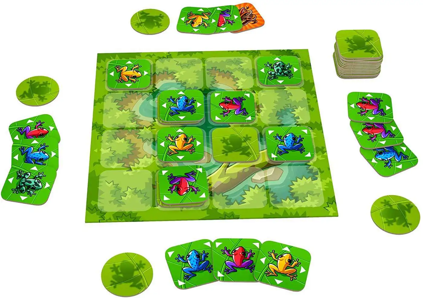 Flip Over Frog is a game to be enjoyed by the entire family! Players will cleverly place frogs on the game board to flip adjacent tiles, hiding some frogs and revealing others. They must plan ahead and avoid snakes to flip their way to victory. The player with the most frogs face up is the winner.