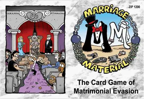It’s Marriage Material, the card game of matrimonial evasion, where the only way to win is to remain blissfully single. Use lame excuses to pass ridiculous commitments on to other players and avoid being labeled as “the marrying type.” Marriage Material is a non-collectible, 110 Card game that is fast, easy to lear, and fun for anyone that has ever dated. Not suitable for overly mature adults or anyone who takes relationships too seriously.
