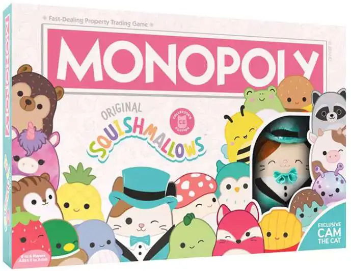 Squad up with the plushiest version of the classic family game youll ever play! MONOPOLY: Squishmallows Collectors Edition lets players buy, sell, and trade their favorites from the Classic Squad to the Fantasy Squad, including Fifi the Fox and Benny the Bigfoot! This special edition comes with an exclusive 4 Cam the Cat plush to start off your journey, plus custom tokens that represent Squishmallows fun. Set up valuable Squads and Collections to be the last one with Squishcash to win!