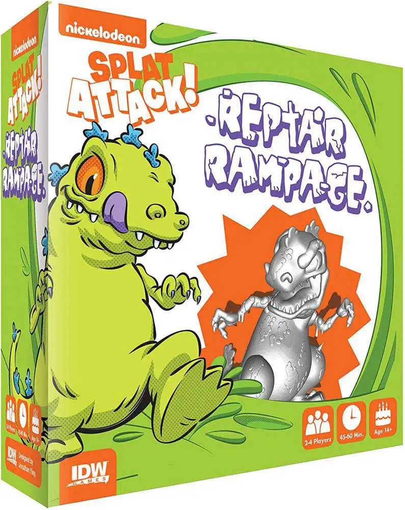 Just when you thought it was safe to return to the cafeteria, Reptar crashes the party! In Reptar Rampage, an expansion to Nickelodeon Splat Attack!, Reptar joins the food-fight fray as an uncontrollable beast of destruction! Attempt to defeat Reptar by teaming up and splatting him with food, but be careful! Every successful splat causes Reptar to rampage, stomping across the board! If you get stomped on, then Reptar eats your points! The player with the most points at the end of the game wins!Nickelodeon Splat Attack! is required to play this expansion.Contents:1 Ginormous Reptar (100mm) miniature1 Character sheet1 Rulebook.