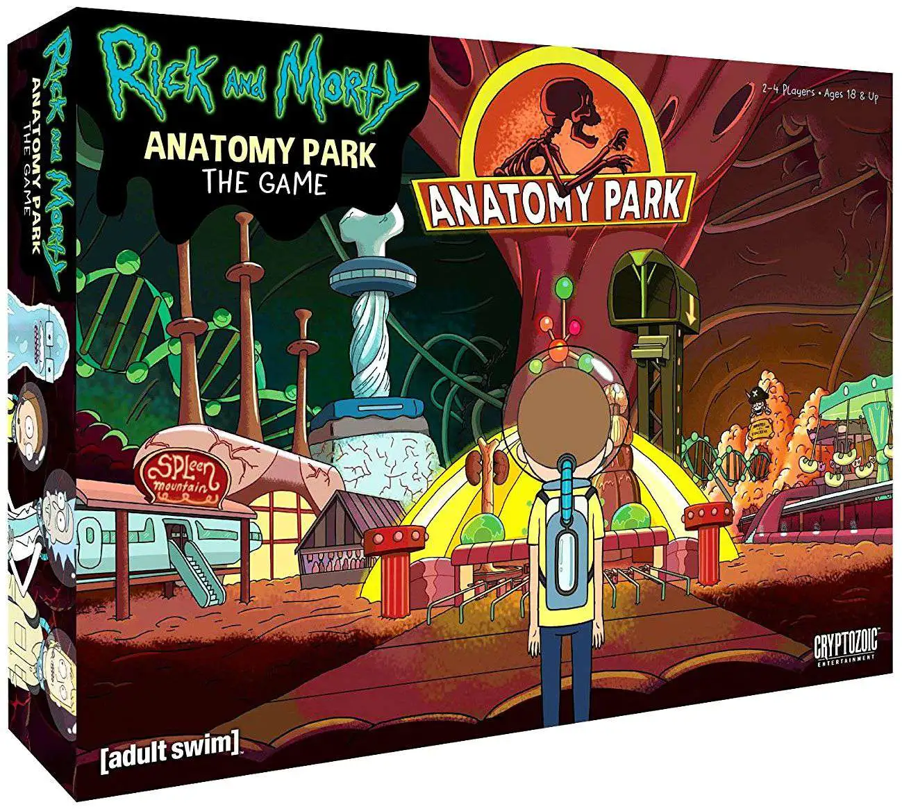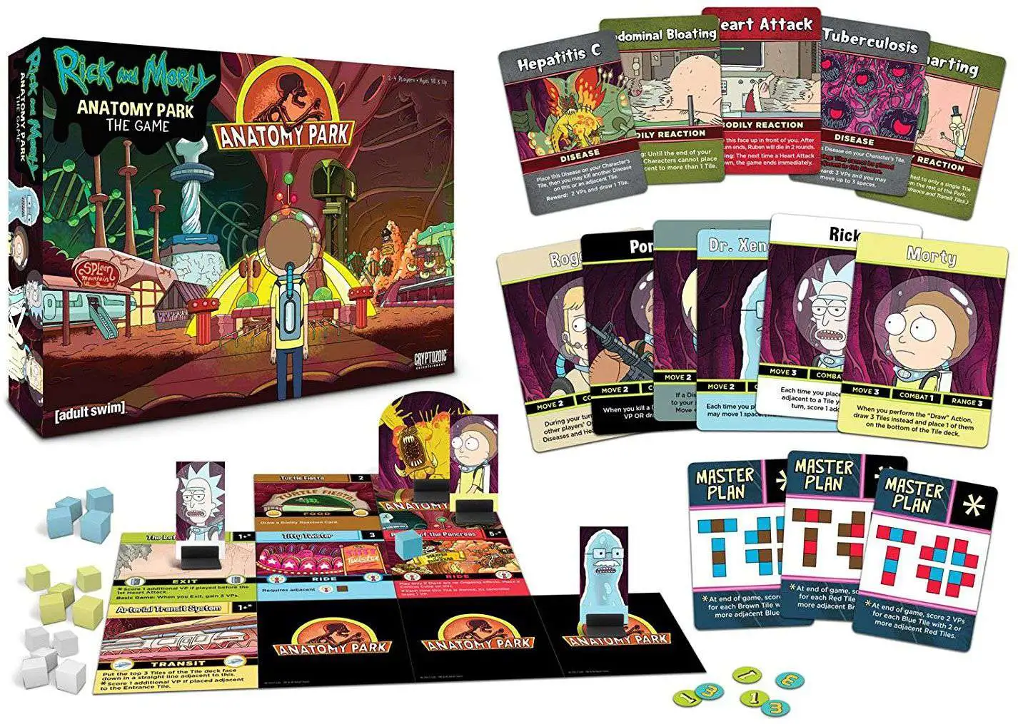Welcome to Anatomy Park! Based on the popular episode of Rick and Morty, this hilarious, competitive tile-placing strategy game takes place within the body of Ruben, the homeless department store Santa! In Rick and Morty: Anatomy Park the game, you and your fellow players will be designing the park, vying for the best spots, and shifting internal organs around to suit your needs. Unfortunately, Ruben is not the most stable host out there, so time (and Ruben) may expire before you know it!