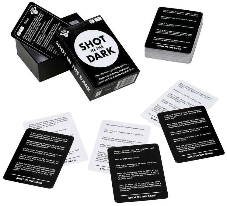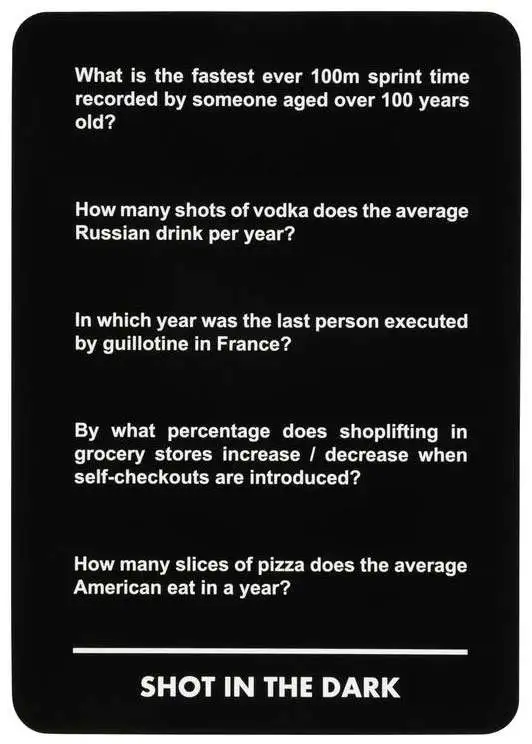 Shot in the Dark is a great game to play with friends or family. No boring quiz questions about capital cities or the Beatles first number one. Instead, Shot in the Dark is a fun party trivia game with hundreds of the most bizarre, interesting and hilarious questions to which nobody knows the answer. If you can’t make an educated guess, then your only hope is a shot in the dark. Guaranteed great fun and interesting discussion whether you (and your friends and family) are trivia masters or terrible at traditional quizzes. Great for dinner parties, family gatherings, pre-drinks, chilling with friends, games nights, long car journeys, travelling or holidays, or for anyone who cannot get enough fun facts and useless knowledge.