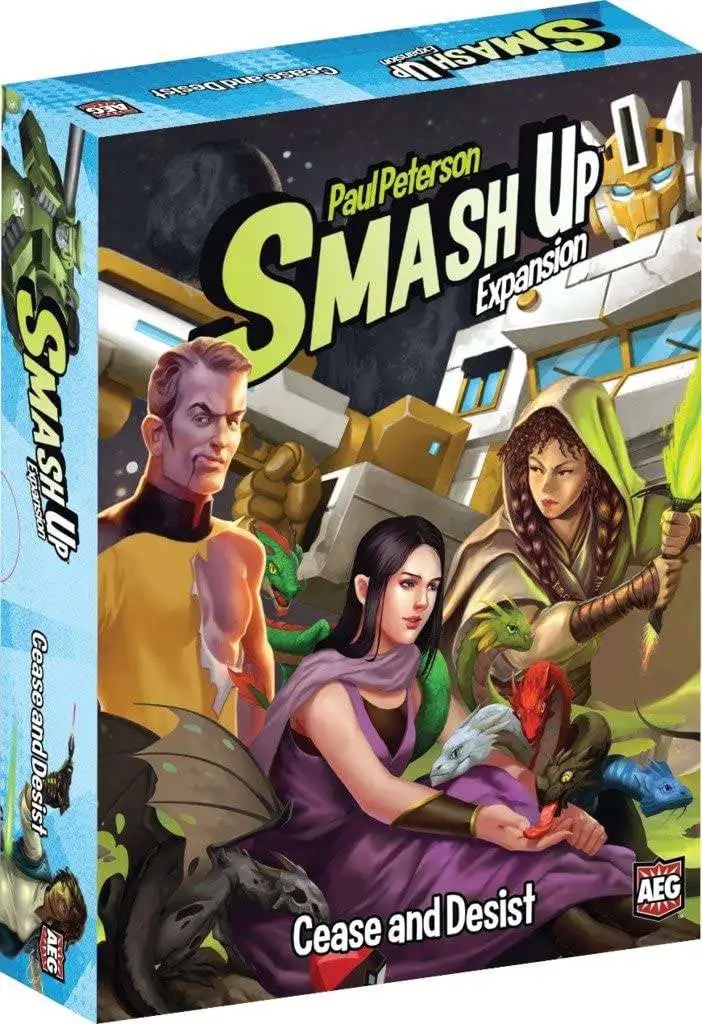 Were gonna totally get busted.Smash Up: Cease and Desist brings you some of the coolest new factions that are TOTALLY not anything at all like some awesome movies and TV shows that we are really into. Not at all.Astroknights use the power of the Fours to defeat your enemies. The Star Roamers move about space teleporting your minions from one quadrant to another. Changerbots can transmorph into various forms with new abilities and strengths. And finally the Ignobles fight over the kings seat but dont trust any of them!Contents:4 20-Card Faction Decks (Astroknights Changerbots Star Roamers and Ignobles)8 Base Cards4 Card Dividers1 Token SheetRulebookAges: 14+Players: 2Game Length: 45 minutesThis game can be played on its own as a two-player game or combined with other Smash Up sets to allow up to four players.