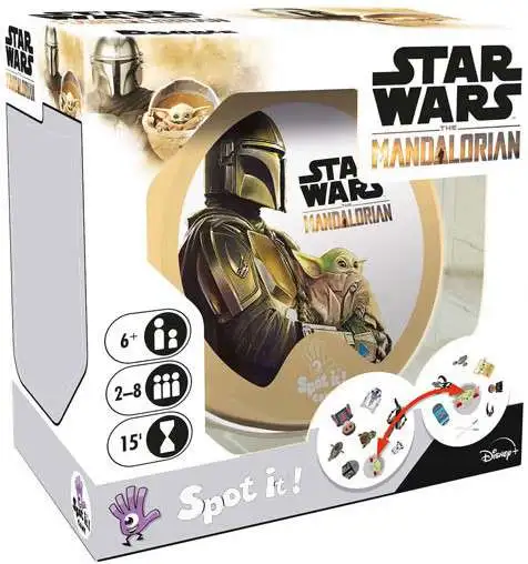 Spot It! is a speed and observation game for the whole family. The aim of the game? Each two cards have one symbol in common. Be the first to find and name it to win the card. This new version of Spot It! combines emblematic characters and objects from the series The Mandalorian with the beloved family game! Players try to spot the single matching symbol between two cards in a playful battle of speedy observation, featuring stylized imagery of The Mandalorian, Grogu, Ahsoka Tano, Kuiil and many more.