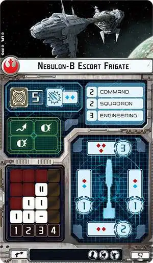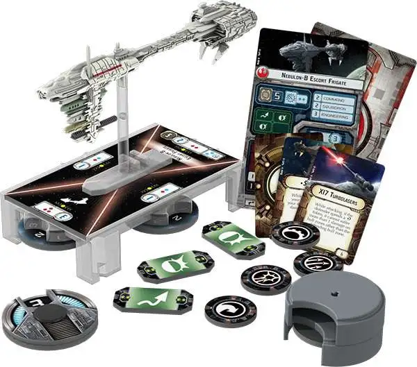 The showpiece of the Nebulon-B Expansion Pack is its detailed and pre-painted Nebulon-B frigate miniature, and the expansion then enhances this ship by supplying all the command dials and tokens you need to fly it, along with ship cards that allow you to build it into your fleet as a fighter escort or as a powerful support ship. Additionally, the expansions eight upgrade cards, which include two unique title cards, allow you to further customize your frigates role within your fleet.