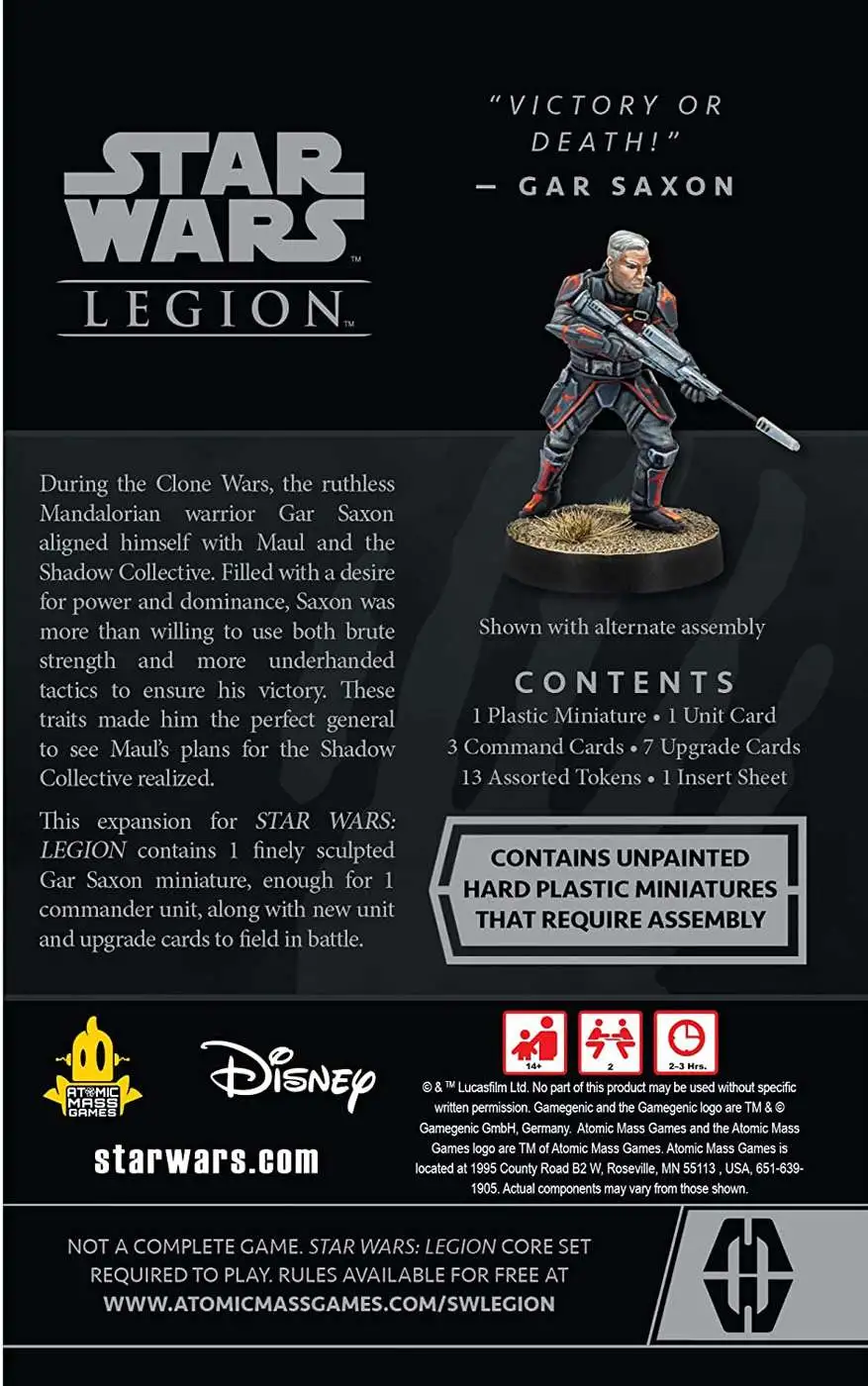 The ruthless Mandalorian warrior Gar Saxon blasts his way into Star Wars: Legion as a commander in Mauls Shadow Collective! Filled with a desire for power and dominance, Saxon gives players even more options for their Shadow Collective forces with his elite Mandalorian training. Whats more, three command cards represent the brute strength and underhanded tactics hes willing to use to ensure victory. Finally, seven upgrade cards give players the chance to equip Saxon with an array of deadly weaponry, including his iconic Galar-90 rifle, jetpack rockets, and a ZX flame projector.