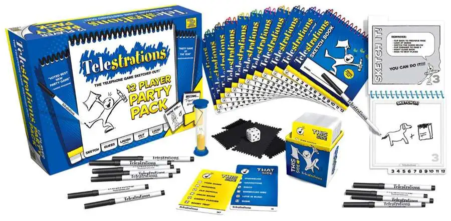 Fans asked — more books for more players – we listened! It’s the all new Telestrations 12 Player Party Pack. Same award-winning laugh-out-loud sketch, pass and guess party game fun where players simultaneously draw what they see, then guess what they saw to reveal hilarious and unpredictable outcomes; but now the outcomes can go even more sideways with up to 12 players and books in play! It’s an engaging game that can be played over and over with many different ages and types of groups/gatherings. And no drawing skills required – really!
