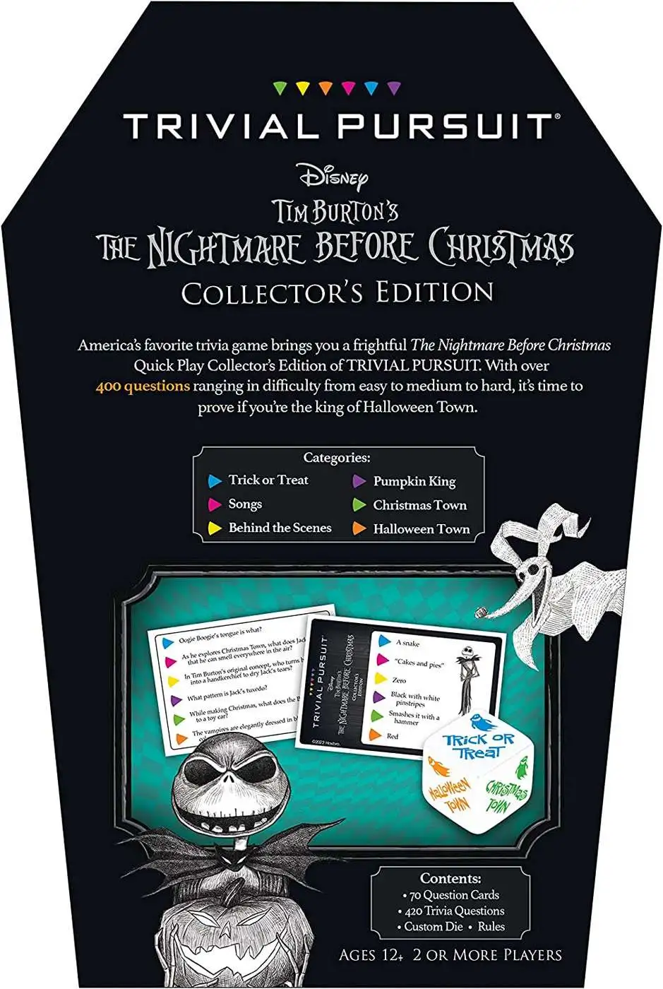 Tim Burton’s The Nightmare Before Christmas Trivial Pursuit Travel Edition is the first and only game where fans can test their knowledge of this holiday classic with 420 trivia questions about the music, iconic movie characters, the Pumpkin King himselfand much more!